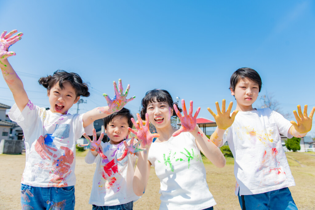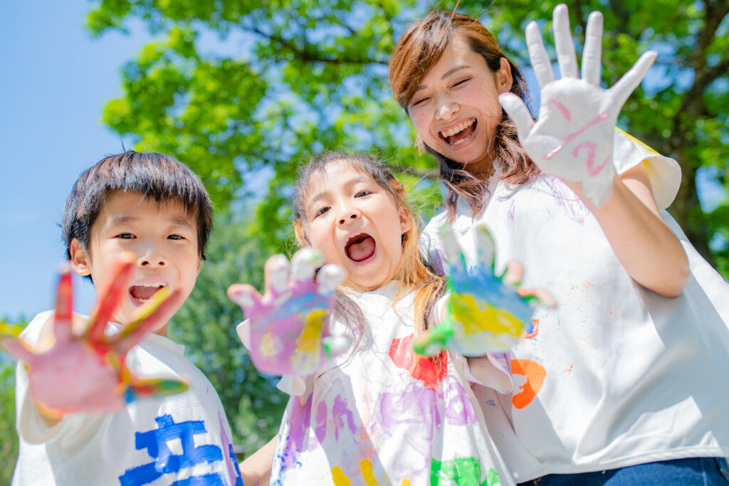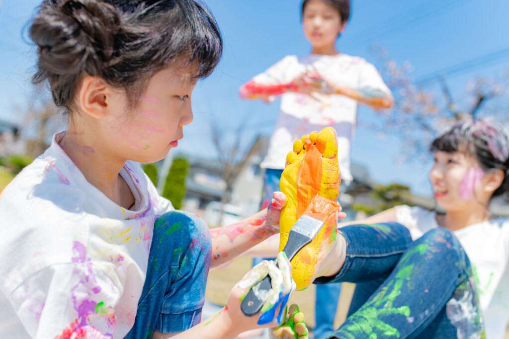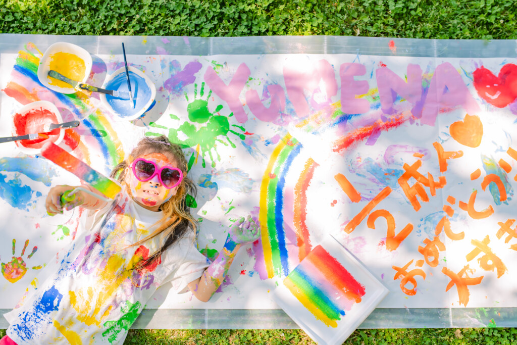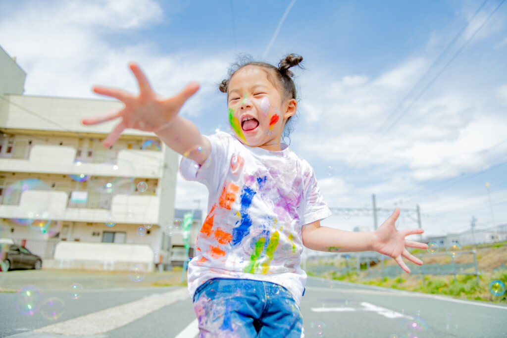使用する絵の具について、安全性が高い、”アレルギー成分の入っていない絵の具”を使用し、手で触って遊ぶ専用のフィンガーペイント絵の具を使用します。肌についた絵の具はお湯で流すとさっと落ちます♪小さなお子様が、万が一口に入れてしまっても安心ですので、小さなお子様から参加できます。